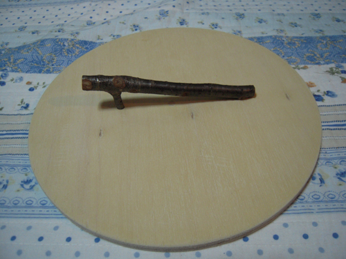 丸く切った板に、桜の枝の取っ手を付けました☆
